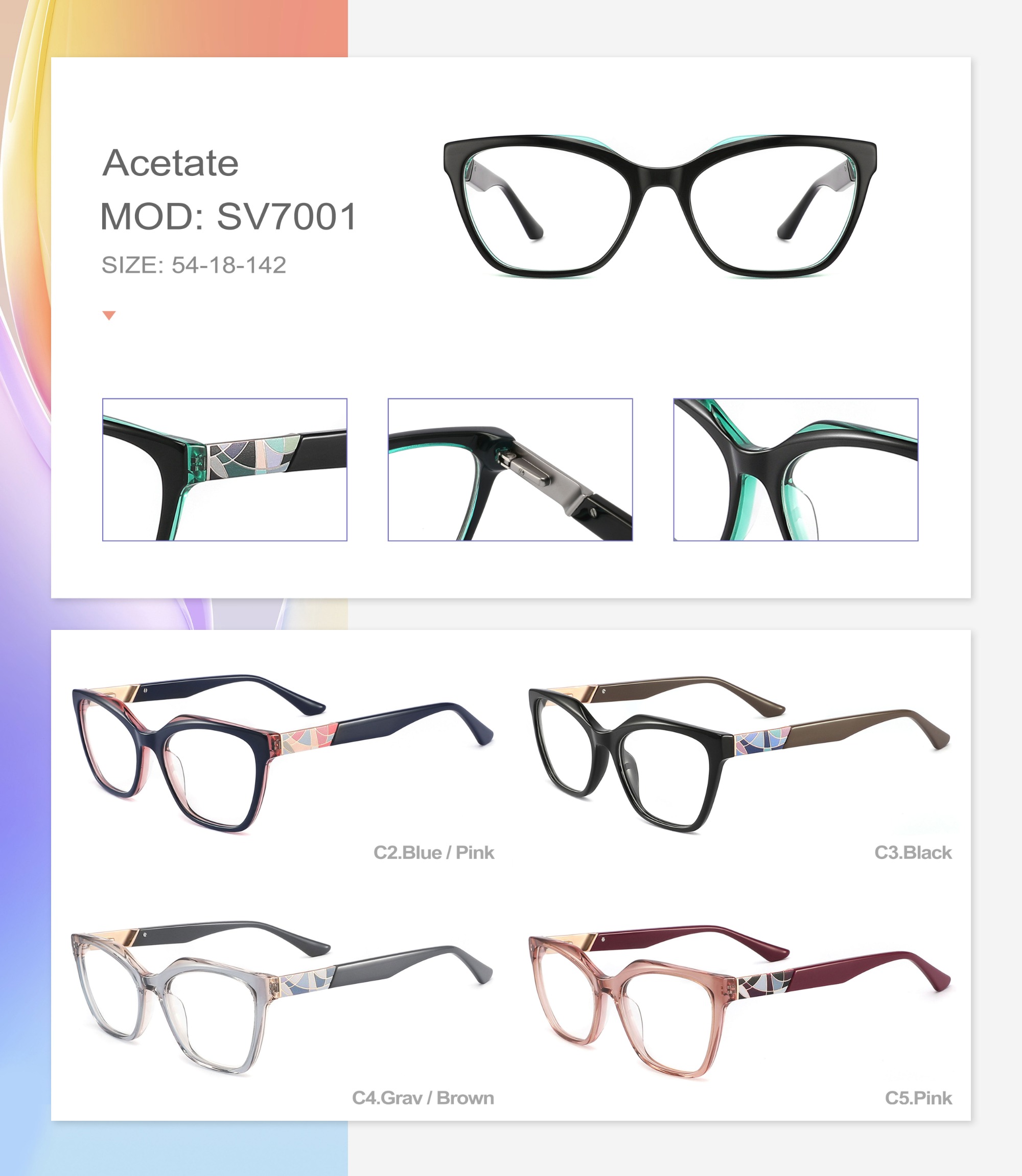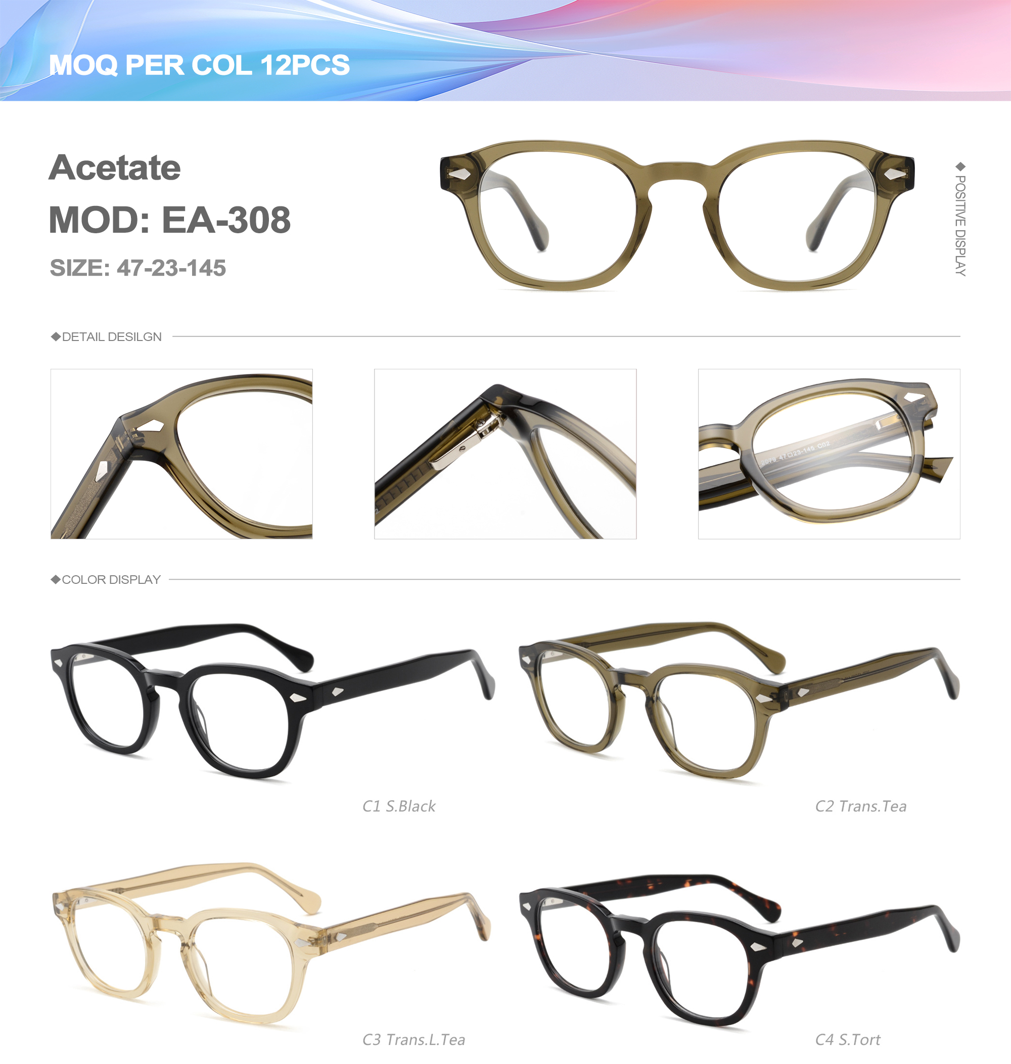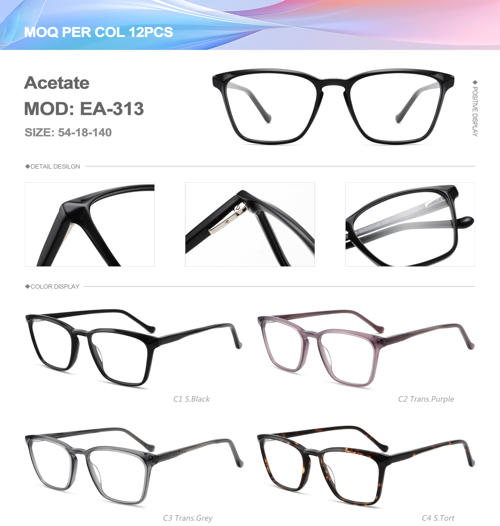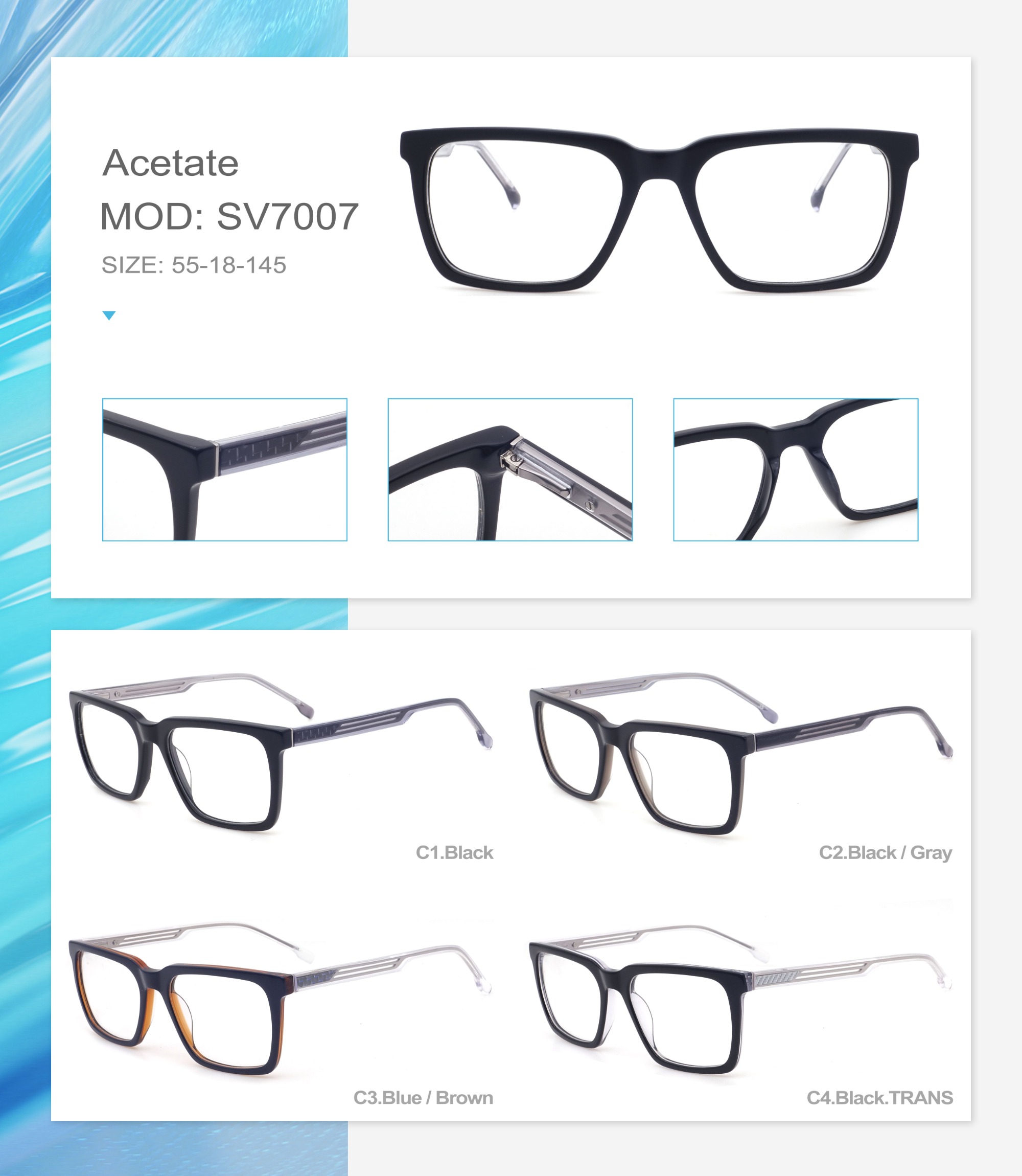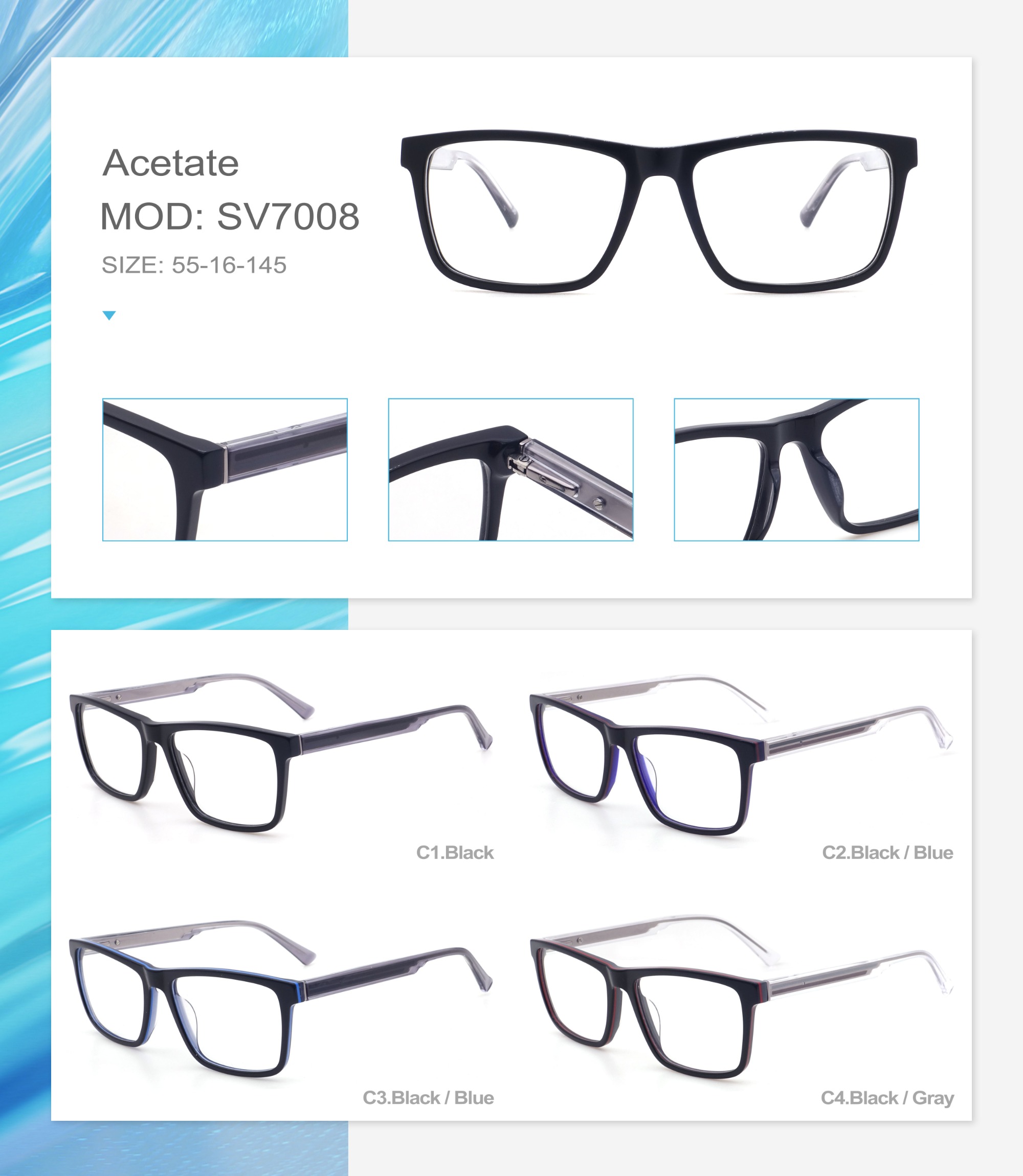 Acetate is an ideal material for eyeglass frames, it is durable and does not cause skin irritation. The acetate frame is made with a unique technology that turns plant material into durable plastic.
