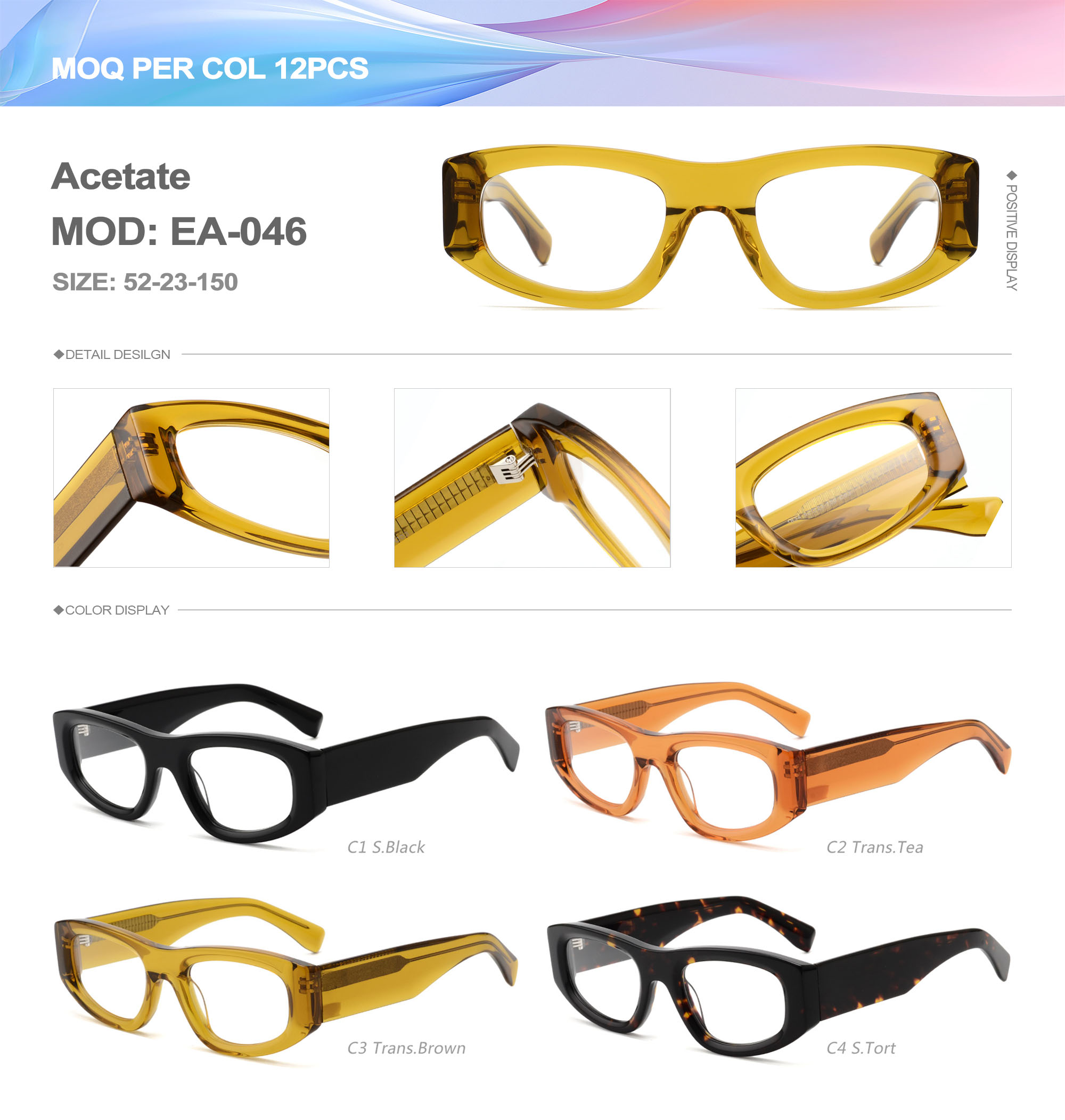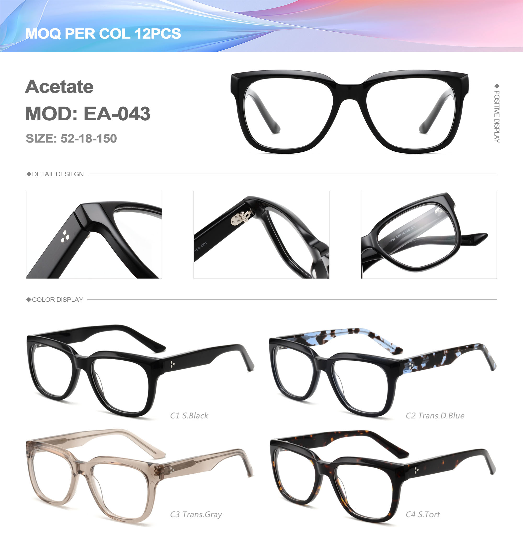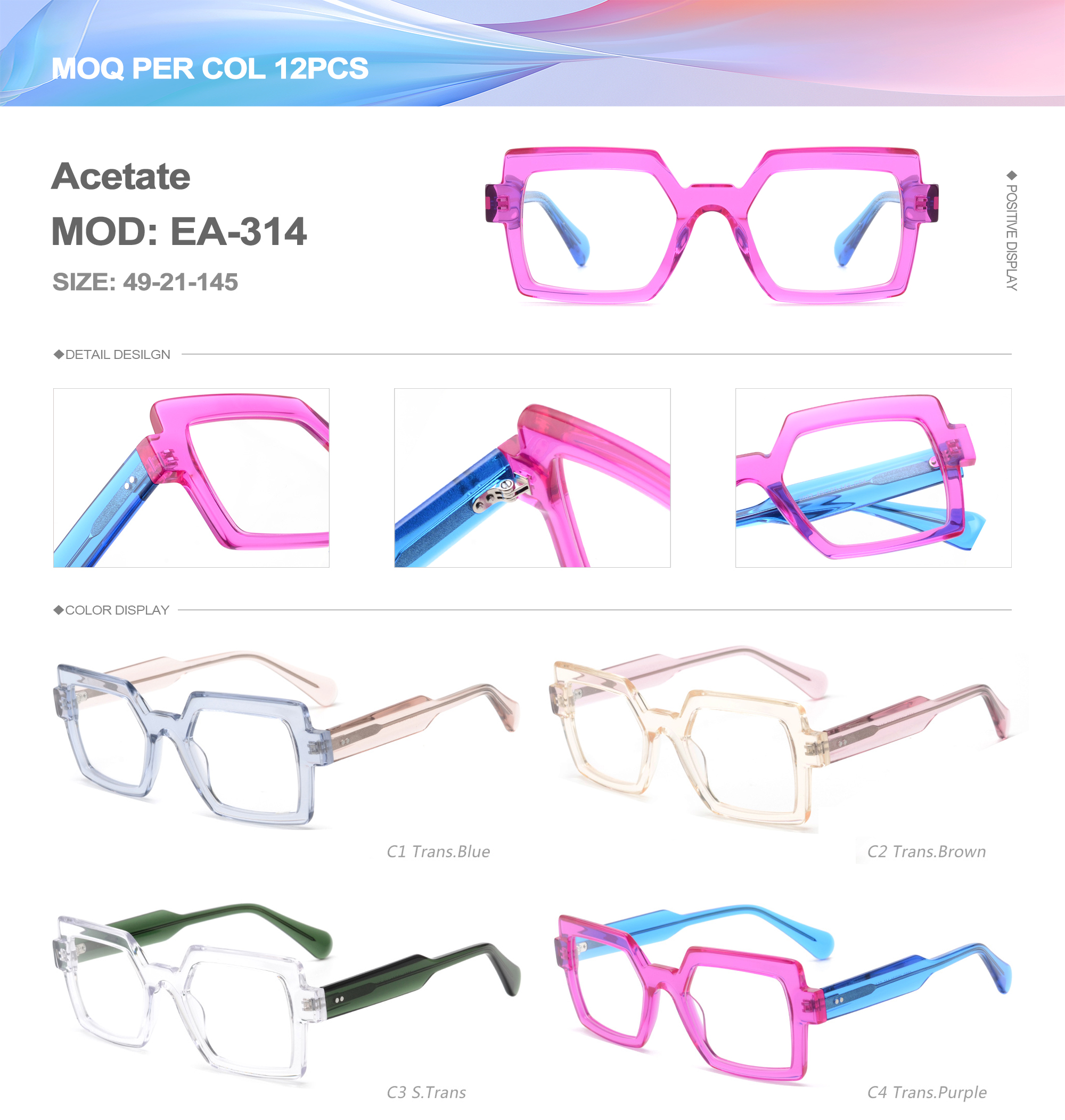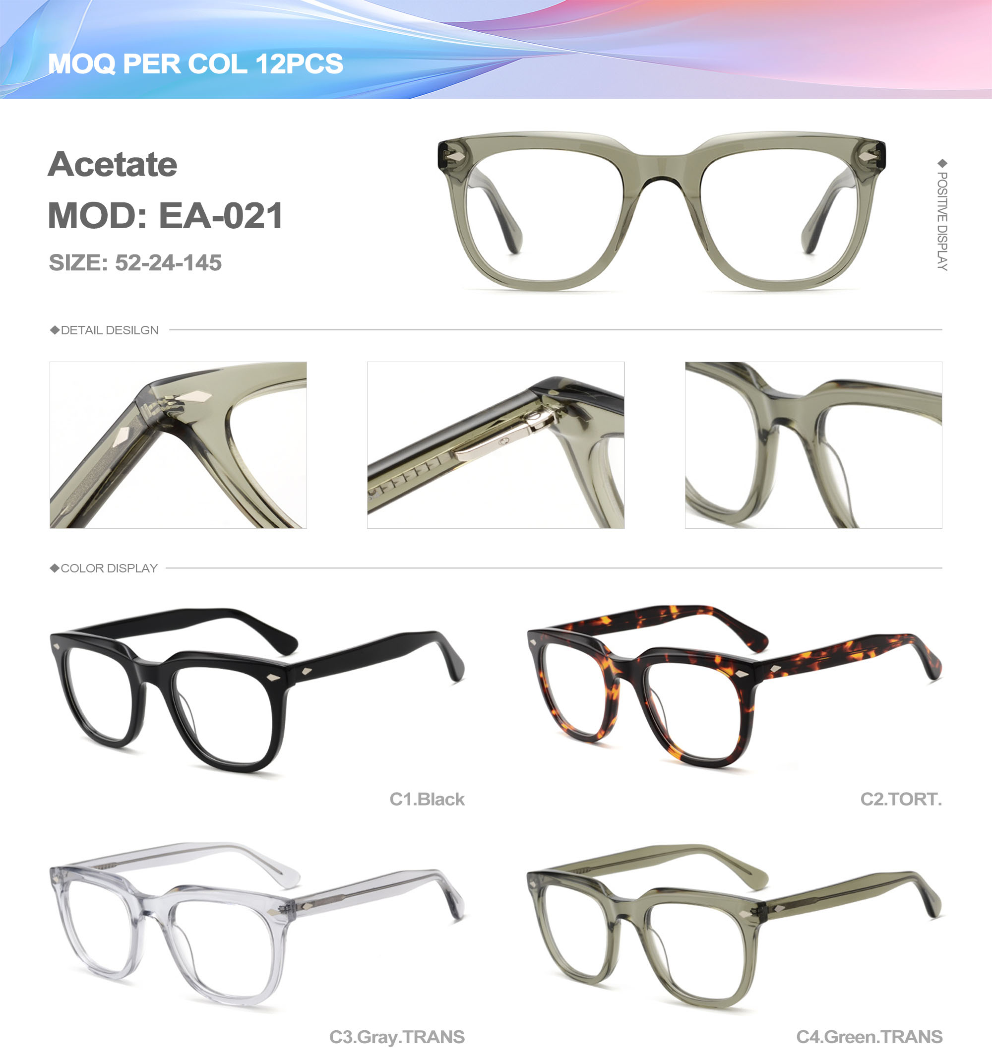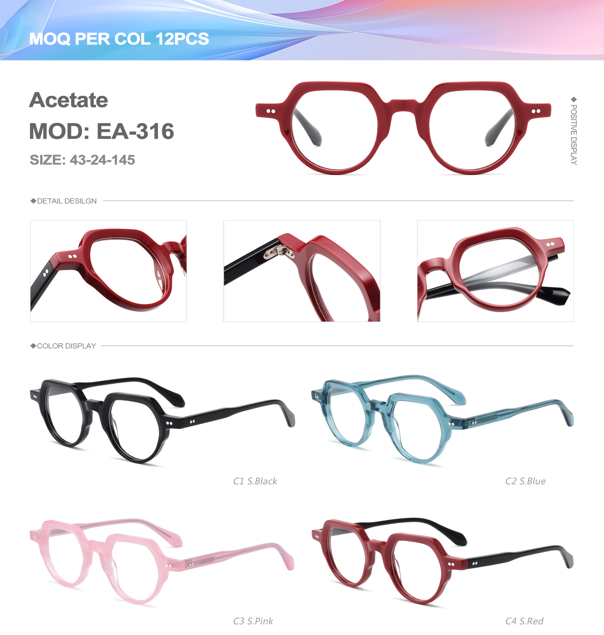 Acetate is an ideal material for eyeglass frames, it is durable and does not cause skin irritation. The acetate frame is made with a unique technology that turns plant material into durable plastic.